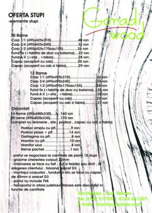 Execut stupi la comanda in orice configuratie . Ex: Stup 10 rame ( fund + corp+capac acoperit OSB) 79 lei peste 15 buc. Stup 10 rame ( fund+corp+capac acoperit cu tabla) 82 lei peste 15 buc. Stup 16 rame orizontal 125 lei peste 10 buc.( 2 urdinisuri , podisor 1/2pfl + 1/2sita , capac cu tabla , manere ) Pretul se negociaza in functie de cantitate si model . Verticali Orizontali ( pt gradina sau pavilion ) Multietajati Elemente : rame , diafragme , hranitoare etc. Tel 0742517595 ( 0744551307)